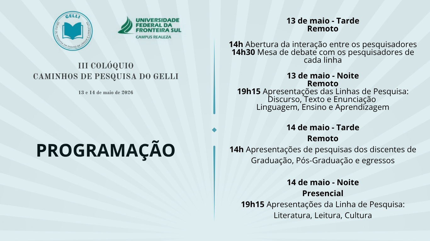 O III Colóquio Caminhos de Pesquisas do GELLI acontecerá em 13 e 14 de maio, como parte da programação da Semana de Letras, na UFFS - Campus Realeza. A programação do colóquio contempla a apresentação das três linhas de pesquisa do grupo, a socialização dos trabalhos de pesquisa em andamento realizados por discentes de graduação e de pós-graduação, matriculados ou egressos, vinculados ao GELLI e mesas de debates entre os pesquisadores de cada linha de pesquisa.